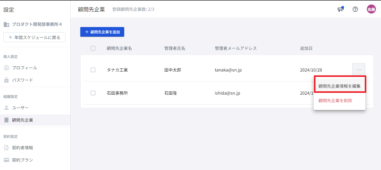 (2)顧問先企業を編集する(アドミン権限・マネージャー権限ユーザーのみ操作可能)