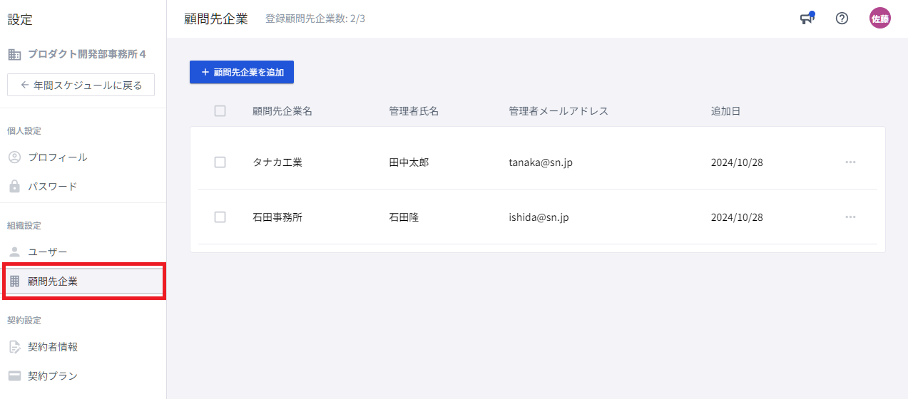 次に「組織情報」の「顧問先企業」をクリックすると、登録した顧問先企業一覧を確認することができます。