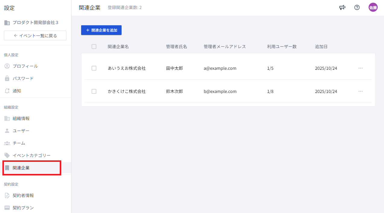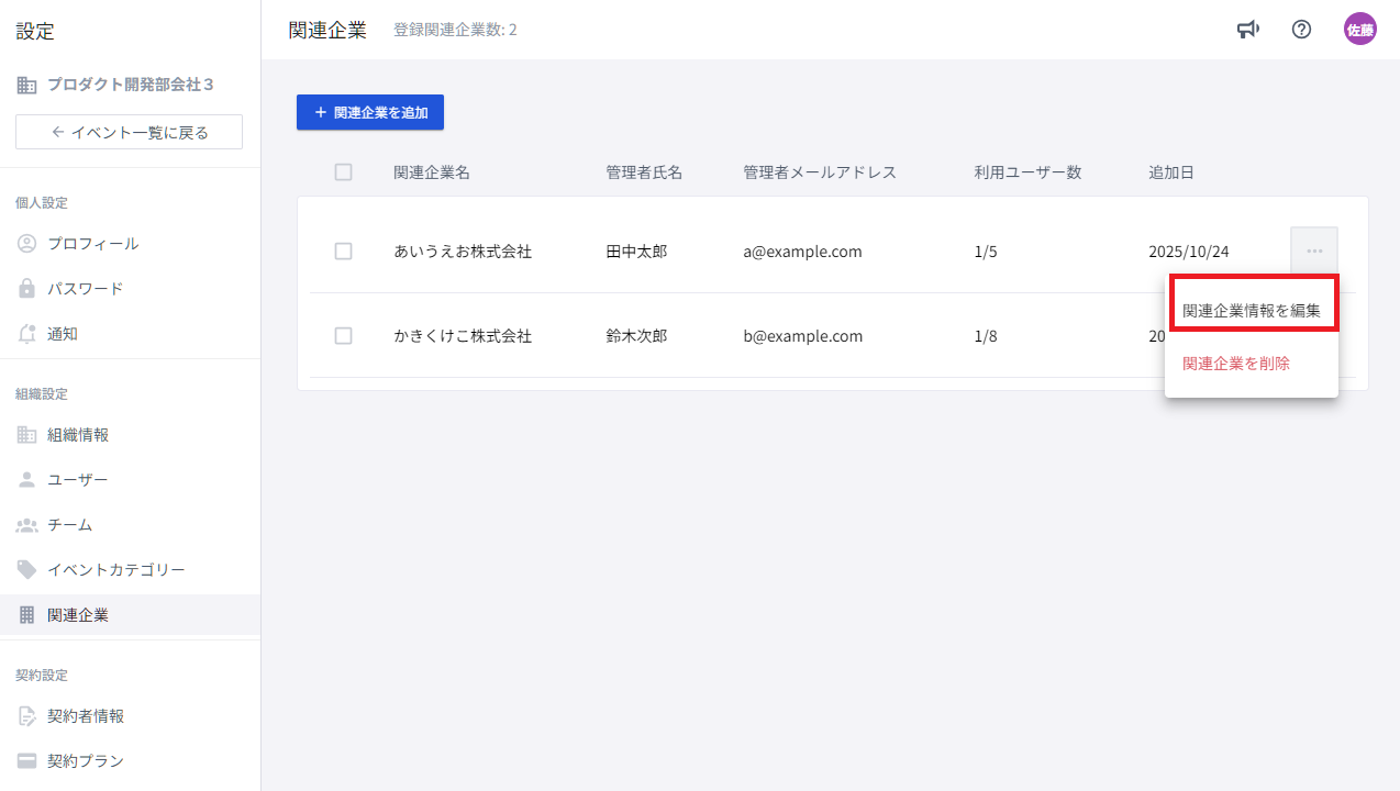 (2)関連企業を編集する(アドミン権限・マネージャー権限ユーザーのみ操作可能です。)