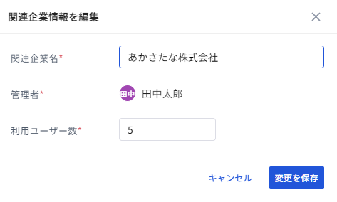 関連企業名、利用ユーザー数の変更が完了したら「変更を保存」ボタンをクリックしてください。