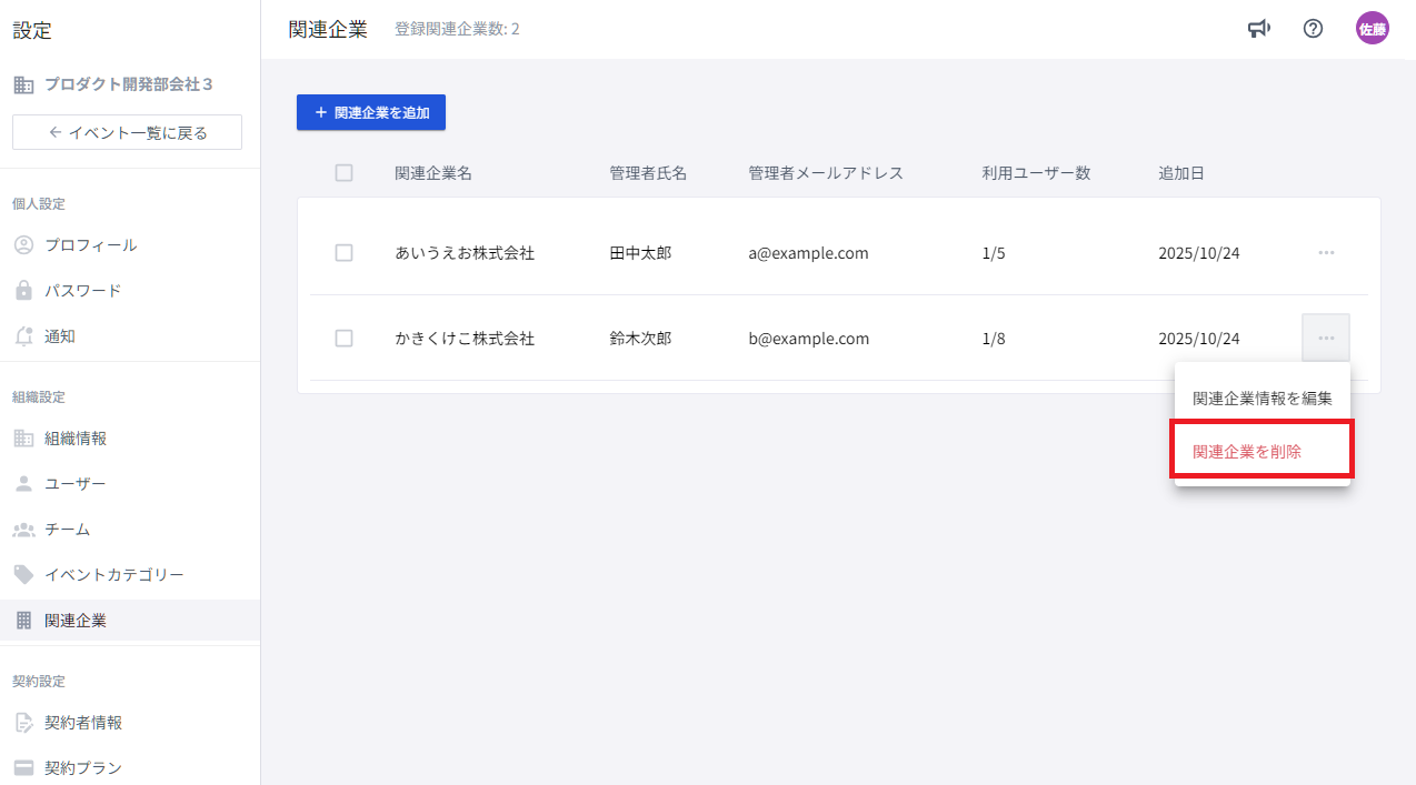 (3)関連企業を削除する(アドミン権限・マネージャー権限ユーザーのみ操作可能です。)