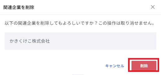 削除した関連企業は復元することができませんので、本当に削除して構わない場合は「削除」ボタンをクリックしてください。