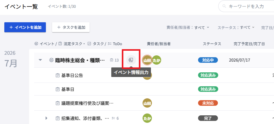 タスク一覧の出力はイベント一覧又はイベント詳細より可能です。