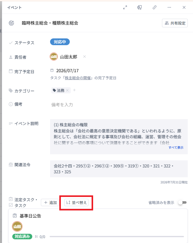 (1)「イベント詳細」の「並び替え」をクリック